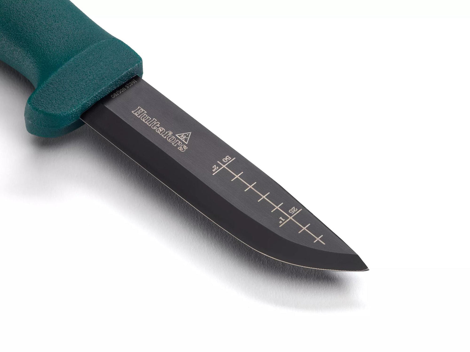 - Slipad rygg på bladet för använding av tändstål samt lasergraverad skala avsedd för friluftsaktiviteter.