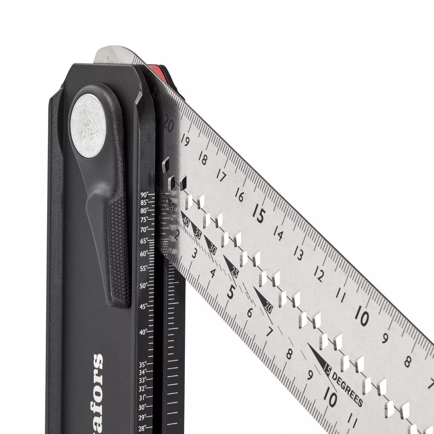 På blad och anslag finns skalor för att mäta och sätta vinklar mellan 0 och 90 grader.