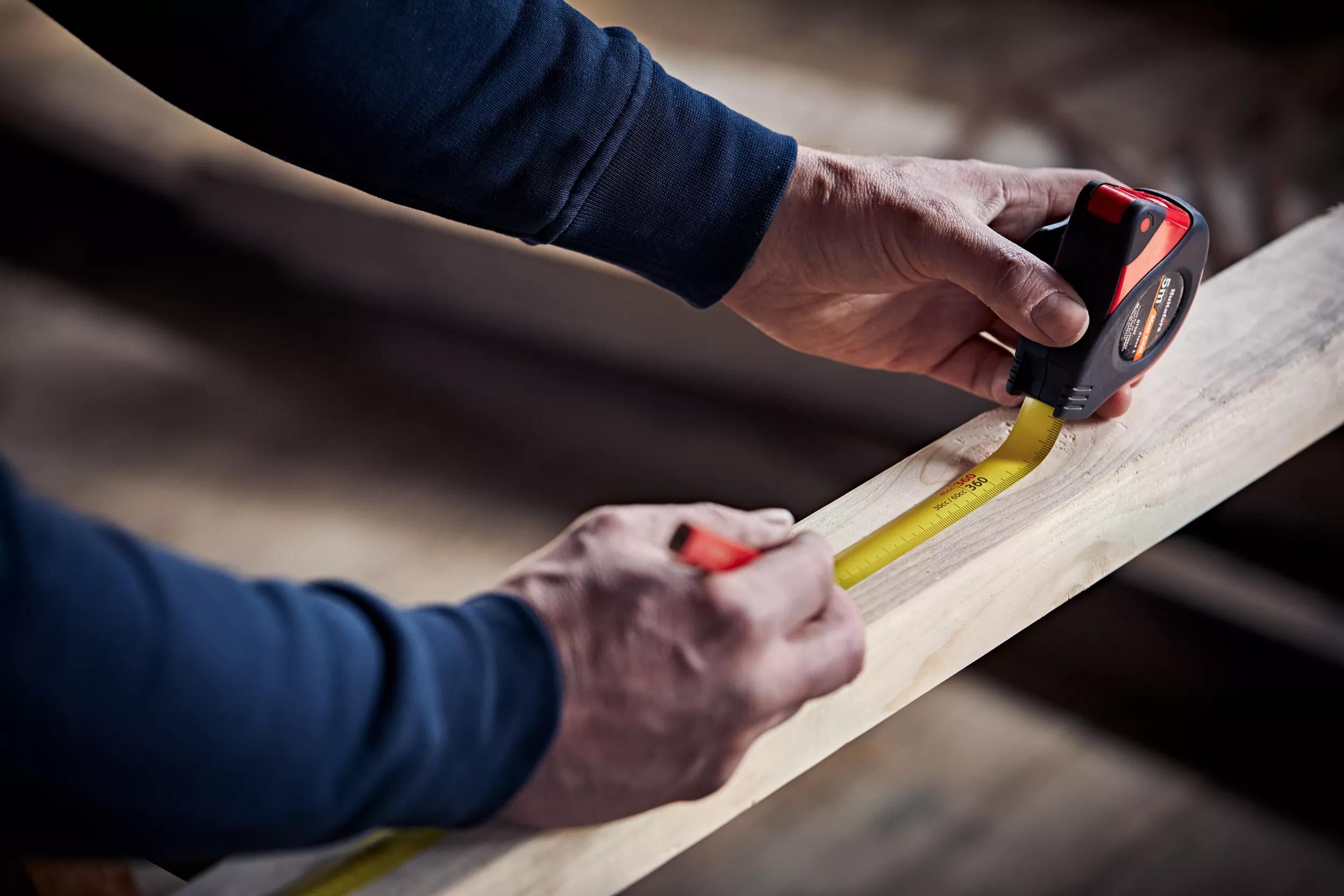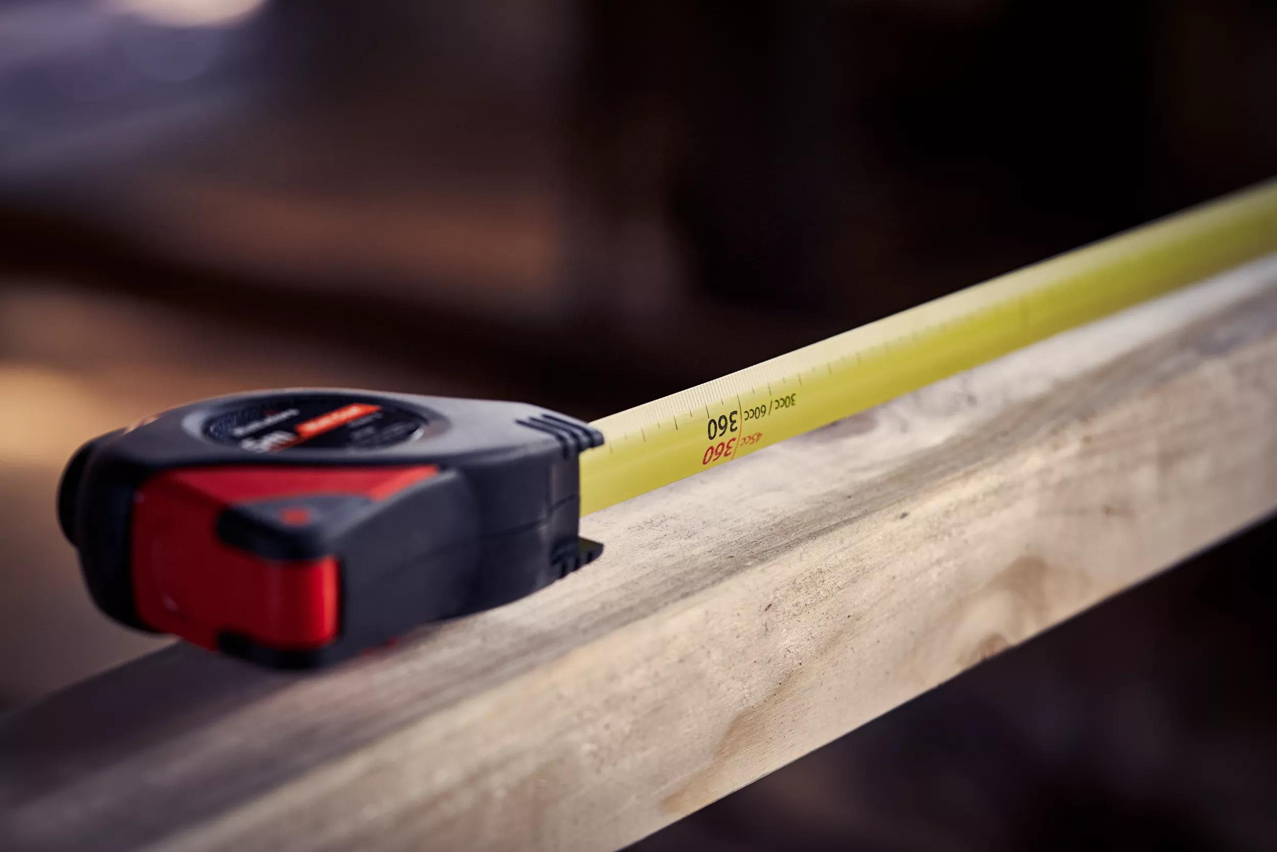 Det gule stålbånd er graderet ved hjælp af en meget præcis blækstråleteknik og har en mat finish, der giver præcis og refleksfri aflæsning. Undersiden af båndet har CC-gradering 30, 45 og 60 cm til f.eks. markering af reglar.