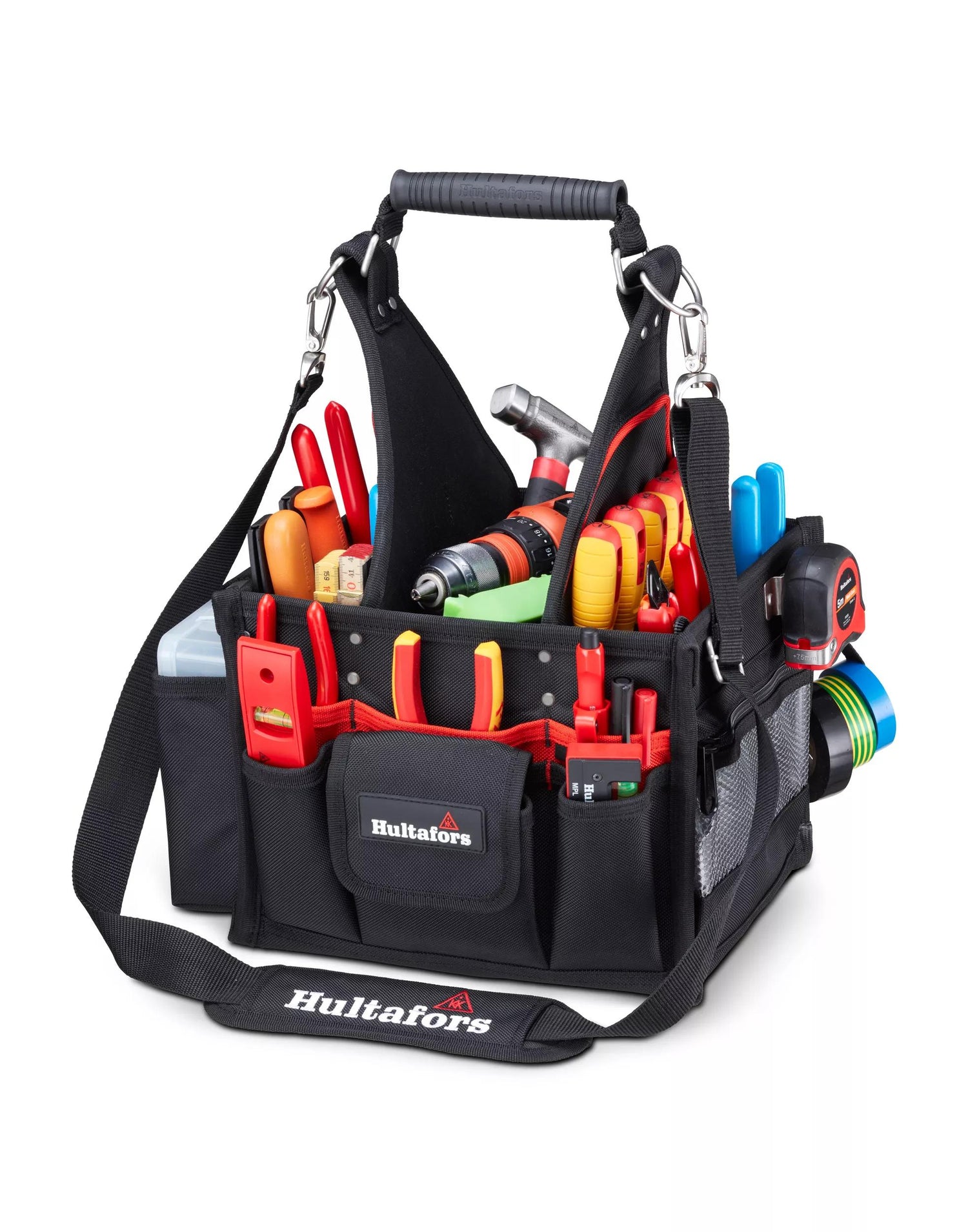Tasken har også en udvendig holder til båndmål, strop til eltape, en nøgleringsholder og elastiske stropper til mindre værktøj som f.eks. skruetrækkere.