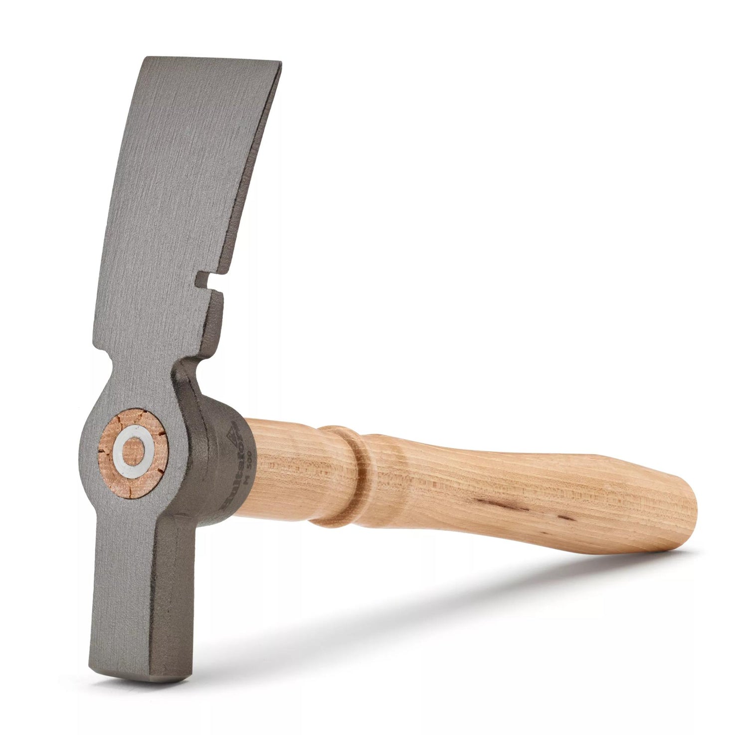 Murerhammer med sandblæst og klarlakeret hoved, hærdet firkantet slagflade og bred slebet mejsel. Med sømudtræk og træskaft i hickory.