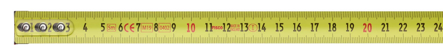 Det gule stålbånd er graderet ved hjælp af en meget præcis blækstråleteknik og har en mat finish, der giver præcis og refleksfri aflæsning. Undersiden af båndet har CC-gradering 30, 45 og 60 cm til f.eks. markering af reglar.