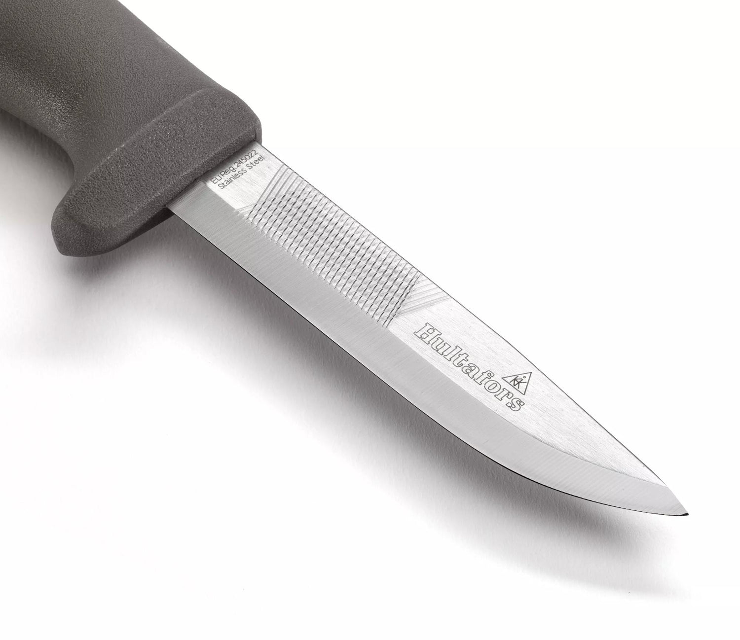 Heizungs- und Sanitärmesser mit Feile zum Entfernen von Grat. Durch die einzigartige Befestigungsweise an Knöpfen der Berufskleidung kann es nicht verloren gehen, ist zugleich aber leicht abnehmbar. Klinge aus 2,5 mm starkem japanischen Messerstahl, einem auf 57-59 HRC gehärteten rostfreien Stahl.
