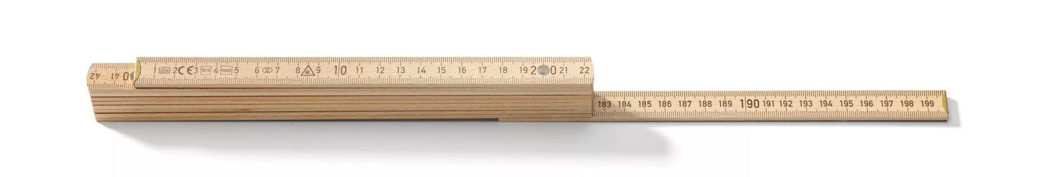 Ein Zentral europäisches Modell aus Buchenholz mit Gelenken aus Schwedenstahl. Die kompakten Seiten bieten eine exzellente Oberfläche für den Werbedruck. 3,3mm starke Glieder sorgen für Stabilität. Metrische Masseinteilung in schwarz auf beiden Seiten.