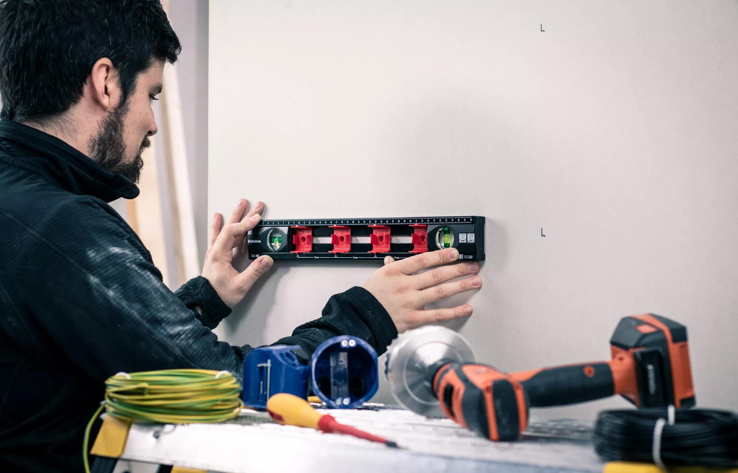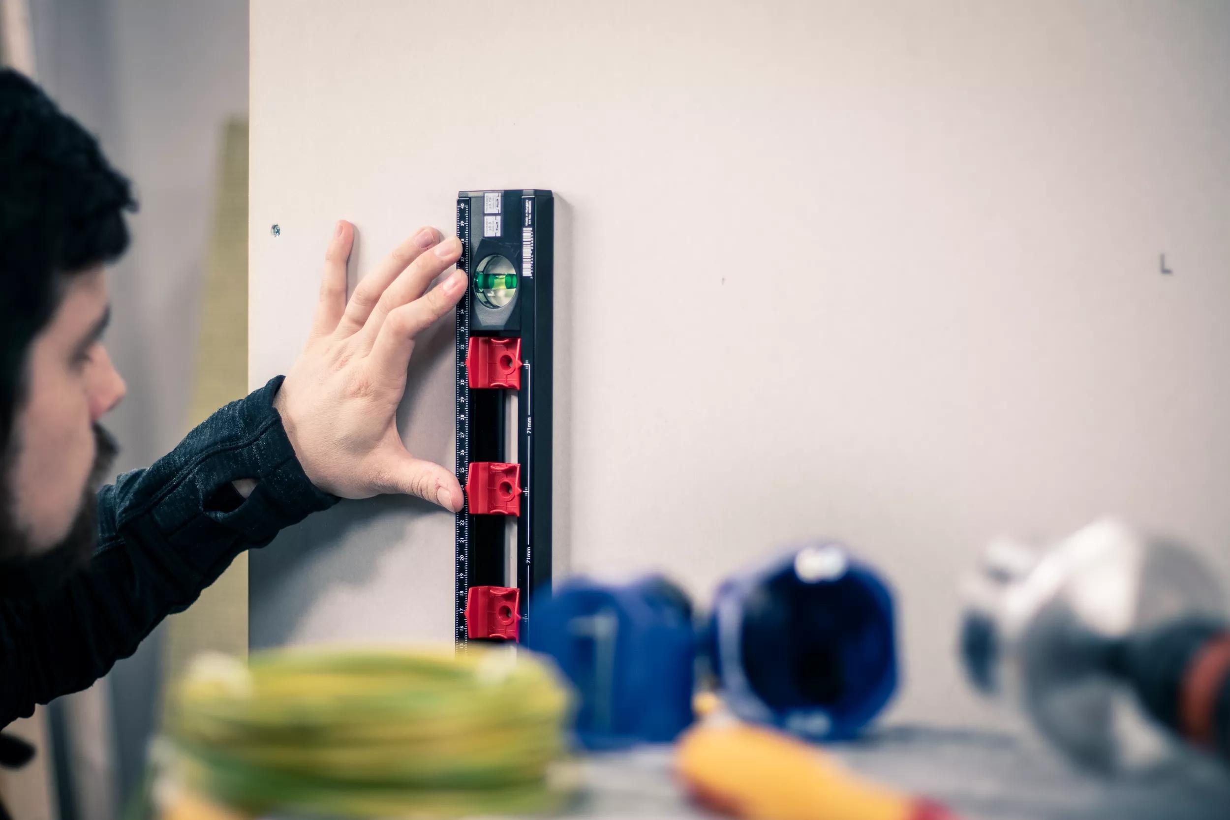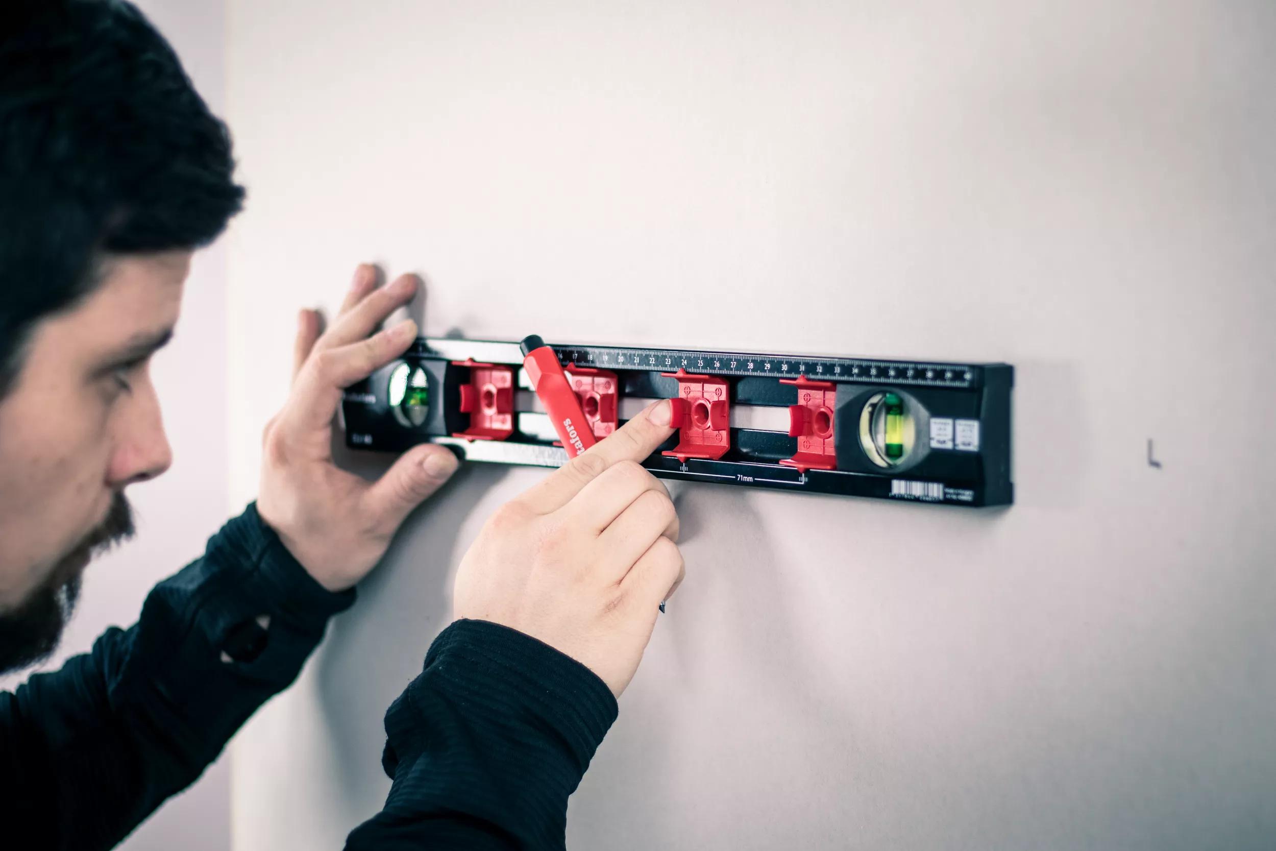 Spirit level for electrical installations. The C-shaped aluminium profile has plastic end pieces and rubber spacers that protects and prevents the spirit level from sliding on the measuring surface. The sliding markers with graded 71mm centre spacing, allows for quick and accurate positioning when installing switch or junction boxes according to DIN 49075.