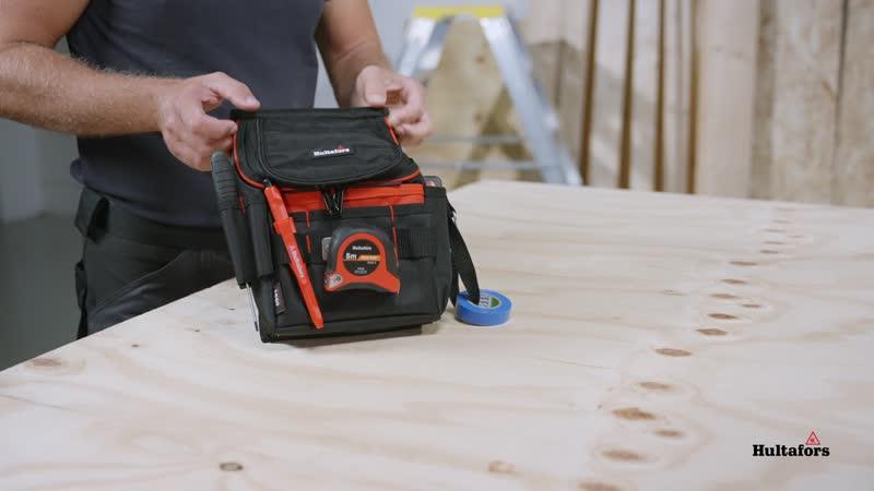 - Suuri etupaneelitasku, teippihihna ja mittanauhan pidike.