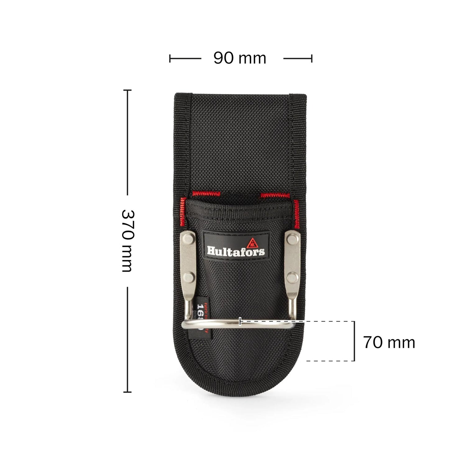 Je kunt hem aan je riem hangen via een lus aan de bovenkant en hij past op riemen tot 50 mm breed.