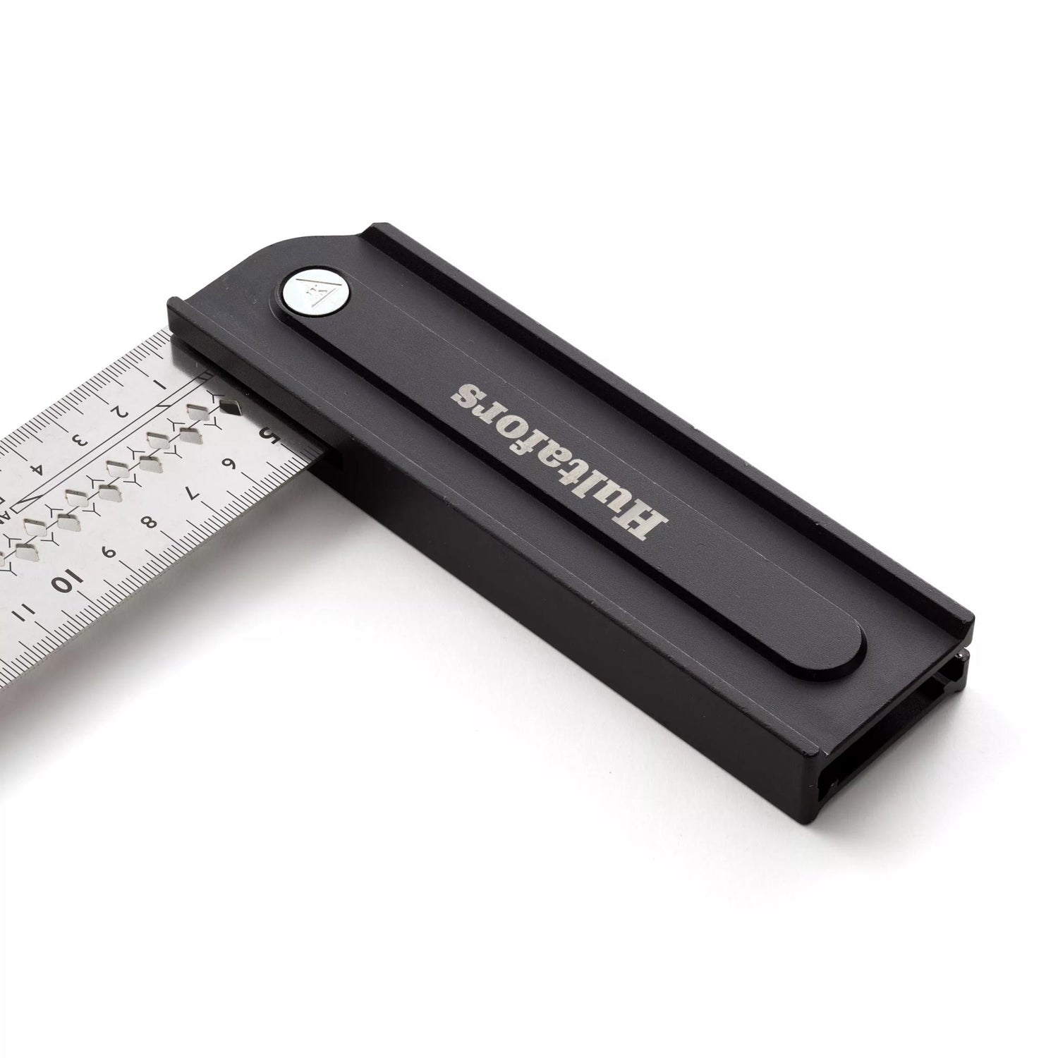 De winkelhaak heeft een scherpe buitenhoek, die andere verstelbare winkelhaken niet hebben. Als je het blad 270° draait, krijg je in plaats daarvan een afgeronde hoek, zodat je in ongelijke hoeken kunt werken.
