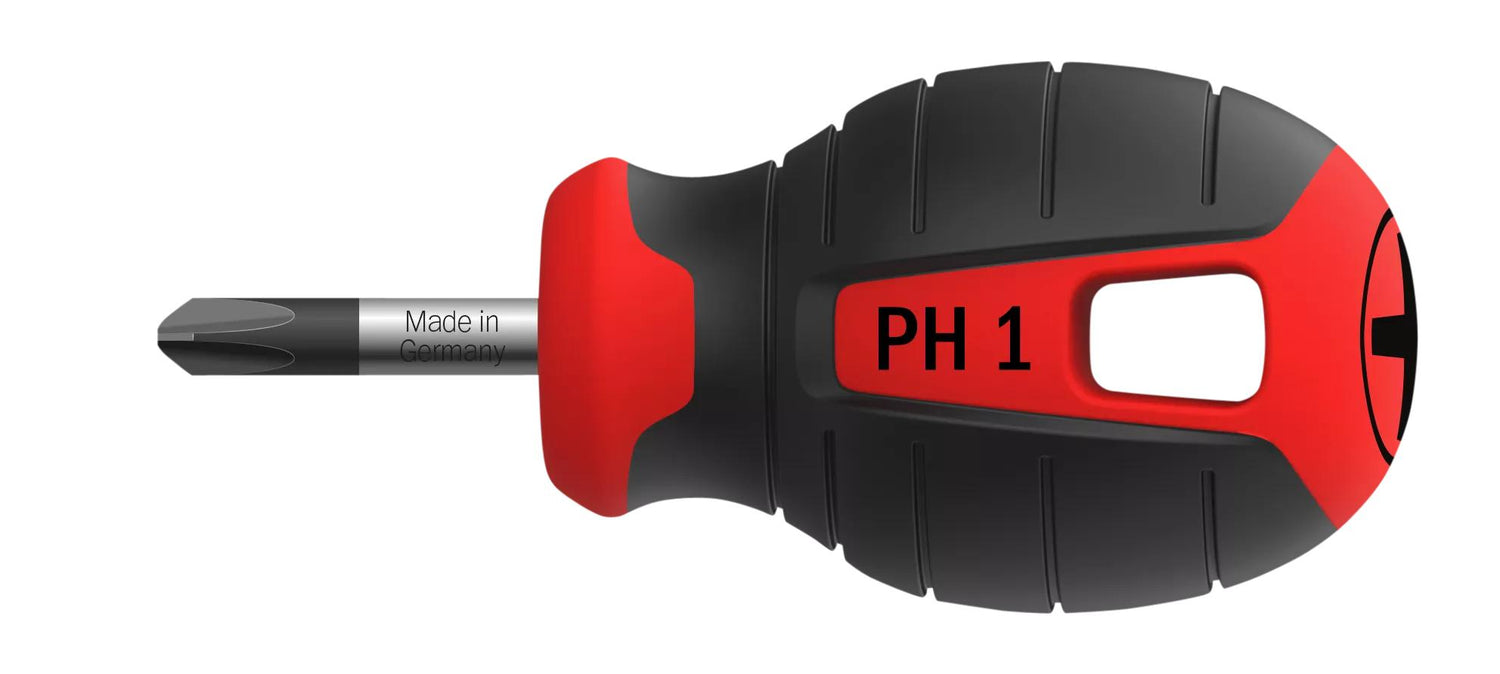 Wkrętak Phillips z krótkim grotem i kompaktową rękojeścią do prac w ograniczonych przestrzeniach. Opracowany do użytku profesjonalnego wspólnie z rzemieślnikami. Uchwyt wykonany jest z wytrzymałego tworzywa PPC pokrytego odporną na zużycie i łatwą do chwytania gumą. Trwałe oznaczenie typu i rozmiaru oraz kolor ułatwiają użytkownikowi wybór odpowiedniego wkrętaka. Rękojeść śrubokrętu posiada otwór do zawieszenia lub zabezpieczenia. Jej kształt zapobiega toczeniu się wkrętaka po pochyłych powierzchniach.