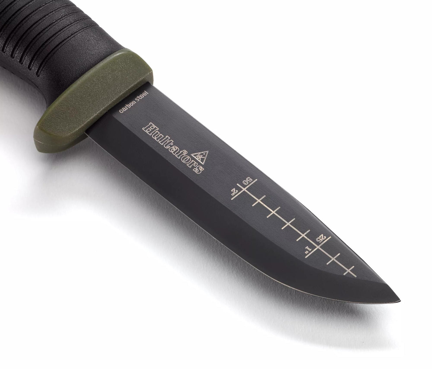 - Slipad rygg på bladet för använding av tändstål samt lasergraverad skala avsedd för friluftsaktiviteter.