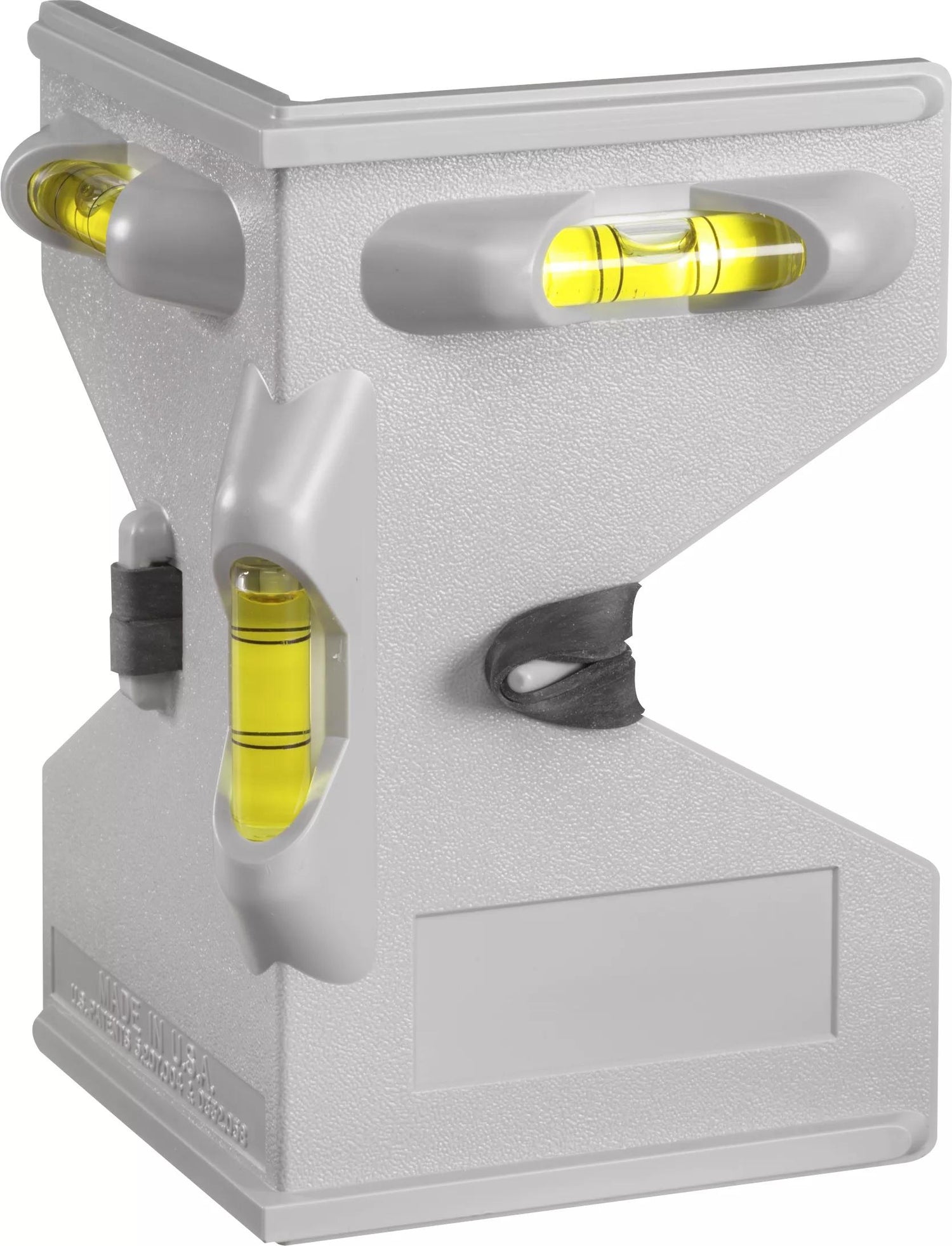 Stolpvattenpass tillverkat i slagtålig ABS-plast med tre okrossbara rörlibeller monterade för att mäta både våg och lod.